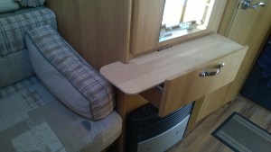 A useful little shelf handy for some extra cooking workspace, for a beer or coffee and occasional bedside shelf. Tucks away under bench seat when not in use. Made from a left over piece of flooring laminate.