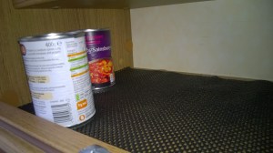 Fed up with rattling pots, pans and bottles etc then one of many cures is to line shelves with the cheap rubber matting you get in pound shops.