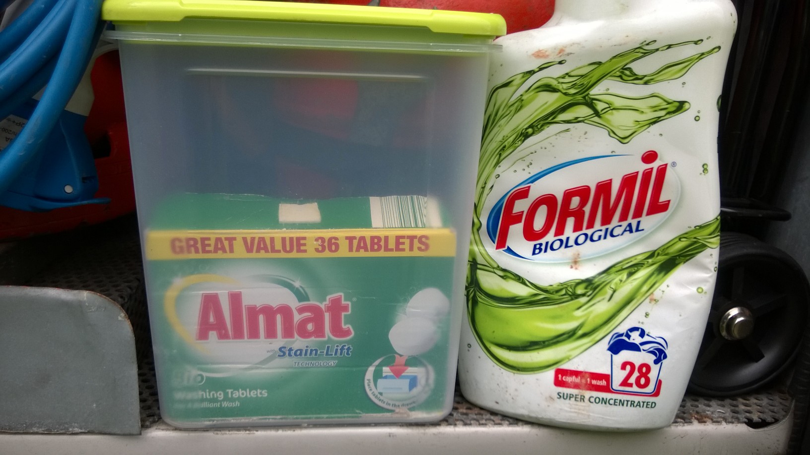 Lidl /Aldi sell these biological washing chemicals or their equivalent. They do just the same job as the expense blue stuff – 1 tablet in the toilet waste tank and 2 capfulls of the liquid into the flush tank (less if only topping up).