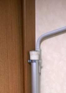 A couple of spring clips from the local hardware shop located on the door post just inside the shower room was an ideal location for the awning handle and awning rafter. Easy to access and store when needed.