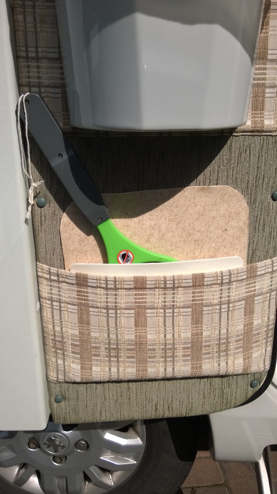 A spare piece of left over floor vinyl – cut to size and folded into the pocket – solved the problem. Easy to remove and easy to clean.