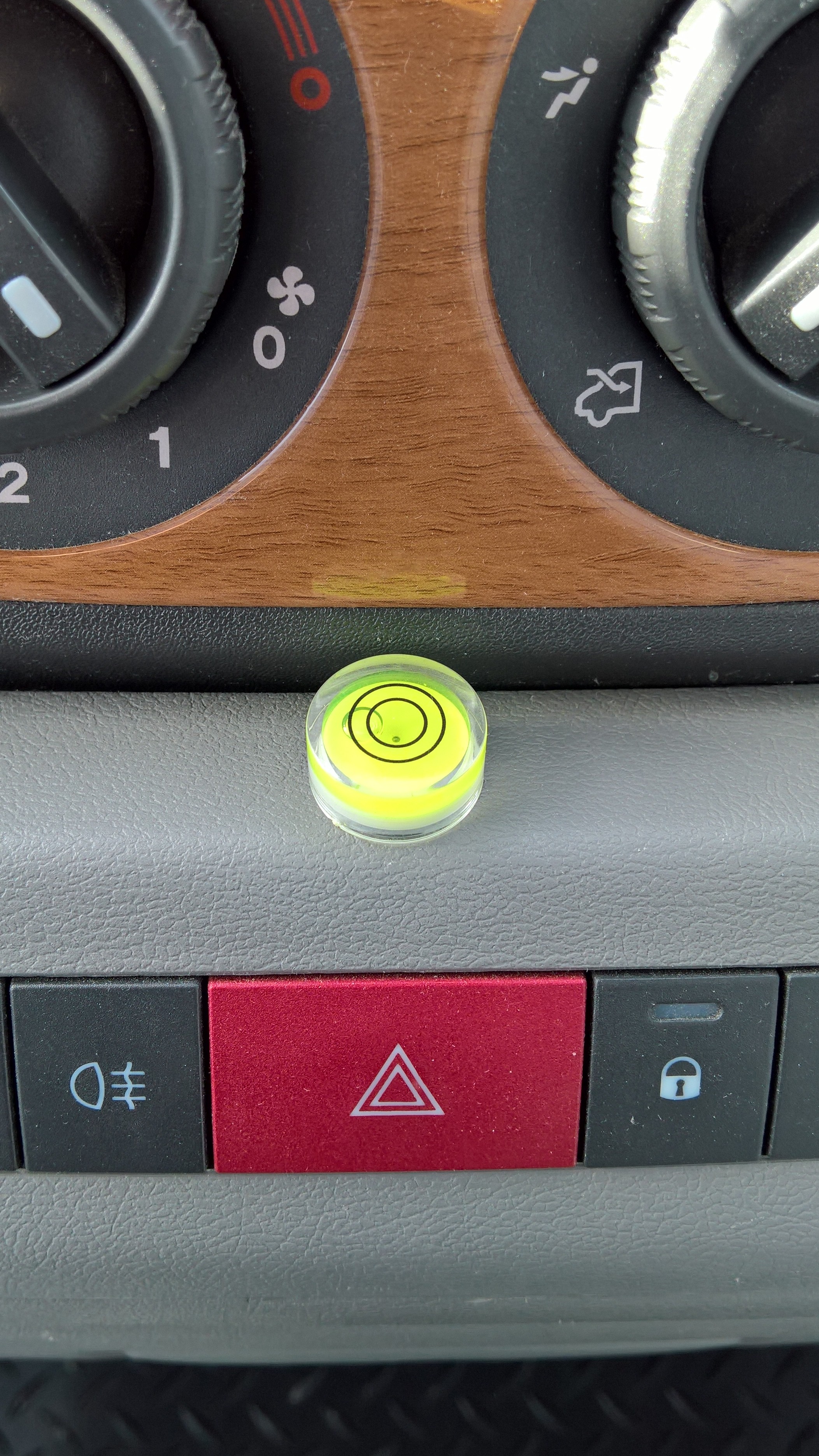 There’s always a small space on the dashboard for a small level like the one in the picture which is just 15mm diameter – and with some bluetac can be fixed at the correct angle on a sloping surface to give a level. Contact me or buy one in mymotorhome.shop
