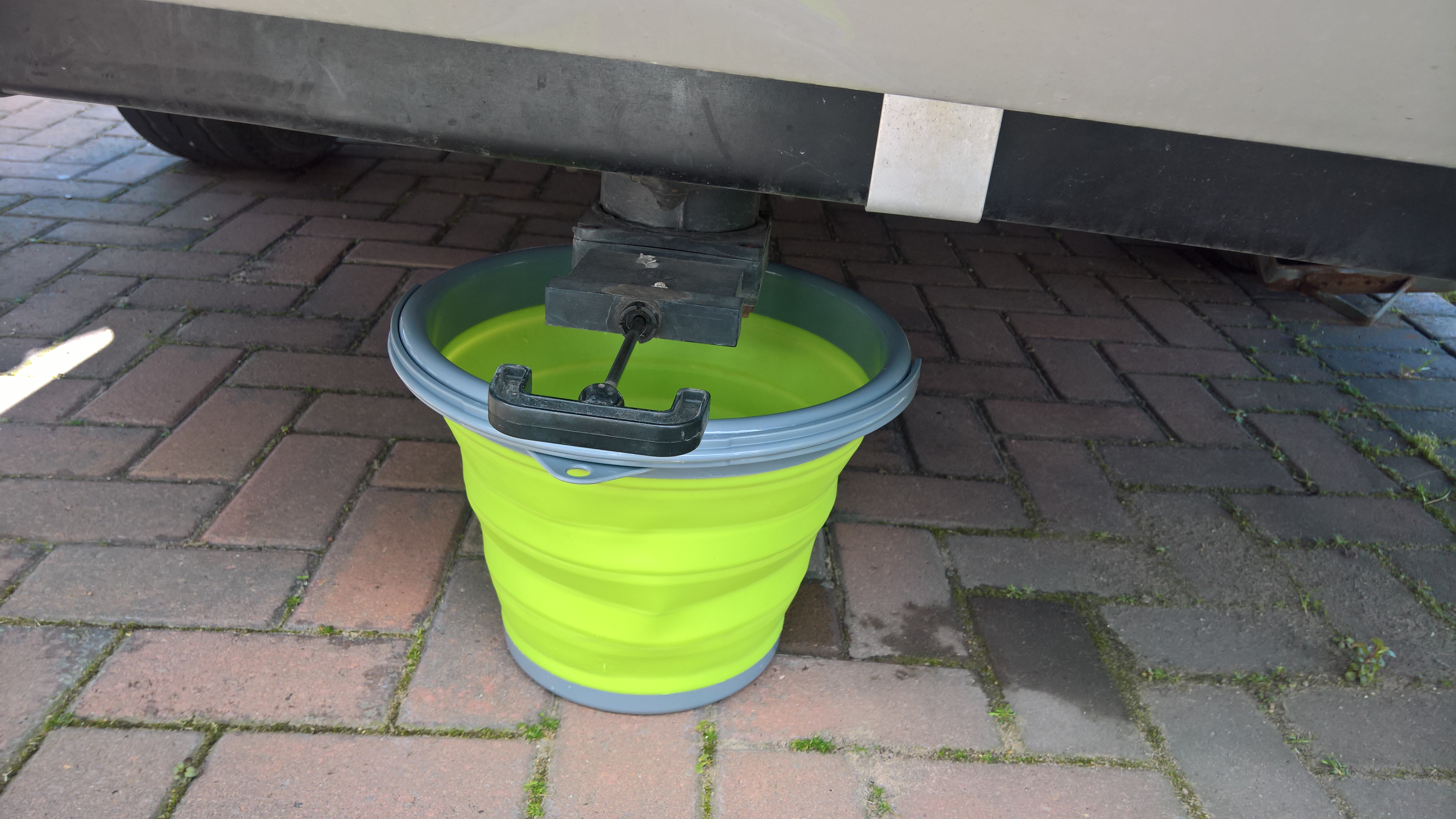 Handy collapsable bucket from Aldi £4.99 (April 2017). Ideal when storage space is tight. It has a 10 litre capacity. Ideal for when a site has no motorhome service point and you have to bucket out the waste each day.