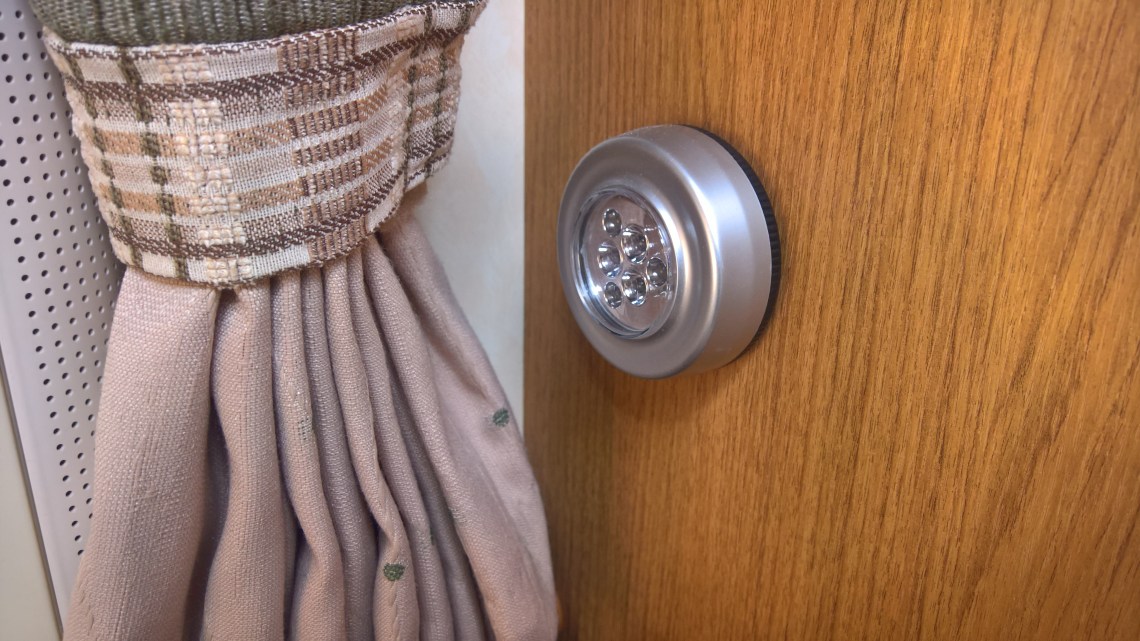 Bought from one of the pound shops makes a handy bedside lamp. Attached by a piece of velcro or magnetic tape for easy removal. Saves having to fumble around to find the overhead locker lights.