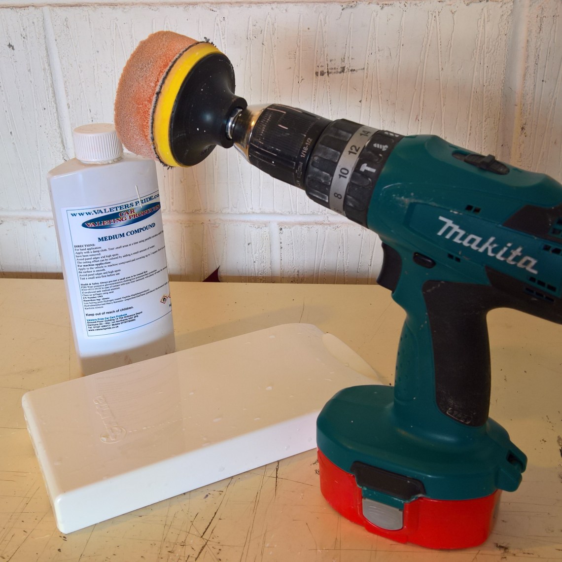 A quick and simple way to white up those yellowing plastic covers (water filler, ehu flap and water heater cover, etc) on your ageing caravan or motorhome. The cutting compound and polishing head for a drill all available on eBay. Easier if you can remove the cover and clean then on a bench – if not then mask any areas not to be “intensely” polished on any paint work. 2 or 3 minutes of polishing brings the covers up to nearly new whiteness.